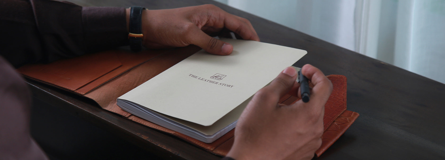 Essential Notebook Organizer - Gun LeafThis beautiful A5 leather notebook organizer is the perfect accessory for those who love simple, clean and functional products. The notebook holder sleeve with a pen slider is designed to keep all your essentials handy. On the left side of the organizer, you have...